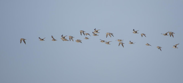 Es un placer ver como llegan los limícolas a las playas. En las fotos de grupos en vuelo solo os voy a comentar las especies que no estén luego sacadas individualmente. En esta foto un zarapito trinador (Numenius