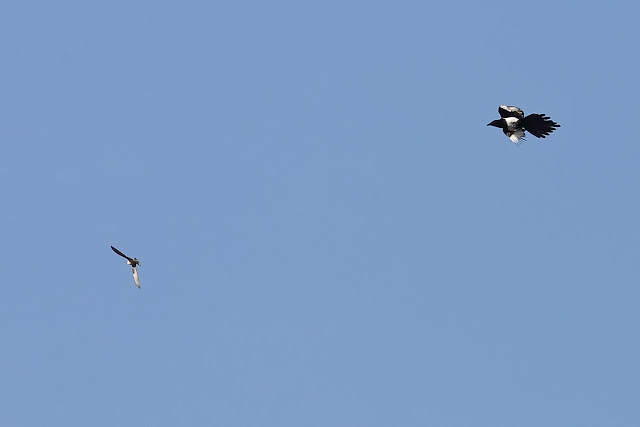 Esta urraca (Pica pica) estaba persiguiendo a los aviones roqueros (Ptyonoprogne